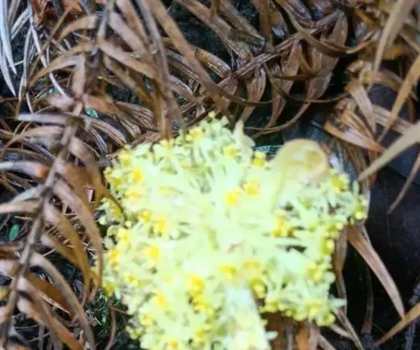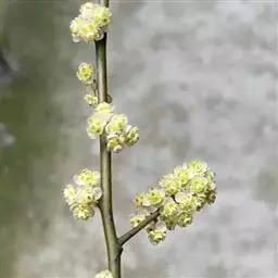 花序顶生,先叶开放,长4-5厘米,多花,具梗,梗长不及1厘米,与序轴密被棕褐色柔毛,基部承有迟落互生的总苞片;苞片线形至丝状,长1-8毫米,位于花序最下部者最长。花黄色,长约4毫米,雌雄异株;花梗纤细,长4.5-6毫米,密被棕褐色柔毛。雄花:花被筒极短,花被裂片6,披针形,近相等,长约3.5毫米,先端稍钝,外面疏被柔毛,内面近于无毛;能育雄蕊9,成三轮排列,近相等,长约3毫米,花丝扁平,被柔毛,第一、二轮雄蕊花丝无腺体,第三轮雄蕊花丝近基部有一对具短柄的腺体,花药均为卵圆状长圆形,4室,上方2室较小,药室均内向,退化雄蕊3,长1.5毫米,三角状钻形,具柄;退化雌蕊明显。雌花:退化雄蕊12,排成四轮,体态上类似雄花的能育雄蕊及退化雄蕊;子房卵珠形,长约1毫米,无毛,花柱长约1.2毫米,等粗,柱头盘状。果近球形,直径达8毫米,成熟时蓝黑色而带有白蜡粉,着生于浅杯状的果托上,果梗长1.5-2厘米,上端渐增粗,无毛,与果托呈红色。花期3-4月,果期5-9月。