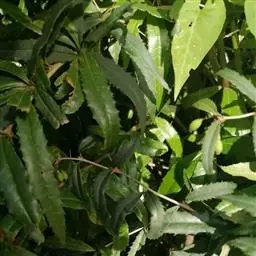 常绿灌木,高约2米。老枝具棱槽,散生黑色疣点;茎刺细弱,三分叉,长7-15毫米,腹面具槽。叶革质,椭圆状倒披针形,长4-9厘米,宽1.5-2.5厘米,先端急尖,具1刺尖,基部楔形,上面栗色,有光泽,中脉和侧脉凹陷,背面棕黄色,中脉和侧脉隆起,两面网脉显著,不被白粉,叶缘平展,有时微向背面反卷,每边具35-60刺齿;叶柄长2-4毫米。