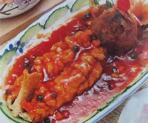 调料:精炼油1500克、、醋100克、干淀粉100克、白糖125克、蒜5克、葱、姜各3克、精盐、绍酒、胡椒粉、番茄酱、湿淀粉适量。