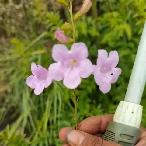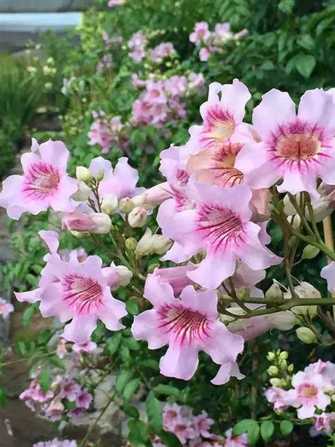粉花凌霄 K.Schum.)是紫葳科魔盒凌霄属的落叶藤本植物。奇数羽状复叶对生,小叶全缘,…