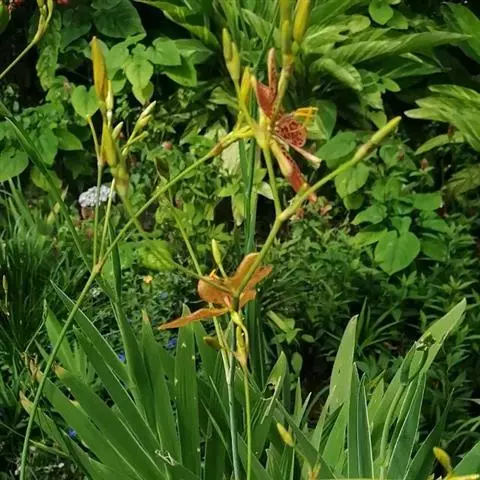 花茎直立,高70-120厘米,上部分枝,花生于分枝的顶端;花下有苞片3-7枚,草质,绿色,长7-12厘米,宽约1.8厘米;花黄色、橙红色或紫色,具深紫色的斑点,直径7-12厘米;花梗绿色,长6-9厘米,花被管半圆形,杯状,外花被裂片椭圆形或倒卵形,长约 7厘米,宽3.5-4厘米,顶端向外平展,内花被裂片倒卵形,较外花被裂片小而狭,长约4厘米,宽约1.5厘米;雄蕊花丝与花柱合生,长约6厘米;花柱长 3.8-4厘米,丝状,顶端6裂,子房长圆柱形。蒴果三棱状圆柱形,上粗下细,长6-7厘米,直径约1厘米,顶端残留有花被的痕迹。品种甚多,花色变化很大,多为淡紫、红、粉红、黄、白等颜色。