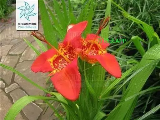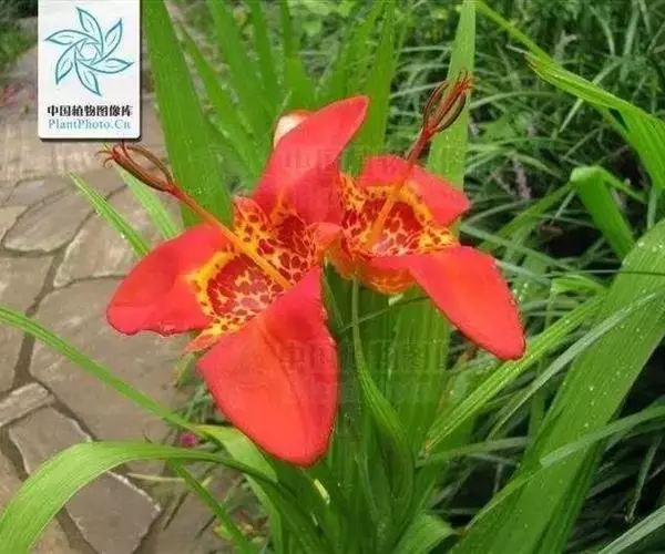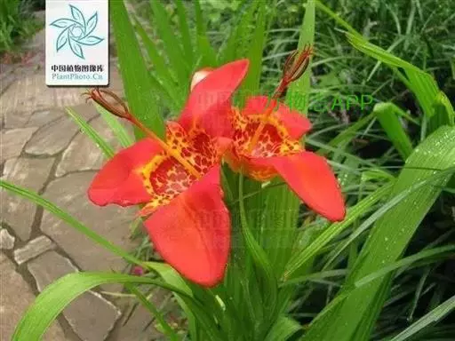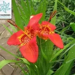 虎皮花(Tigridia pavonia (L. f.) Ker-Gawl.)球根花卉,高40~60厘米。球茎圆锥形。 叶片剑形。花梗自叶丛中抽出,花正面为三角形,花瓣6枚,外轮3瓣大,红色、黄色、橙色、粉色或白色,内轮3瓣较小并具洋红色、紫色或赤褐色斑点。花期6~7月。