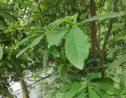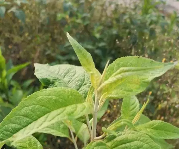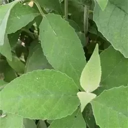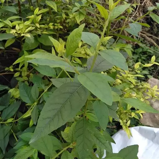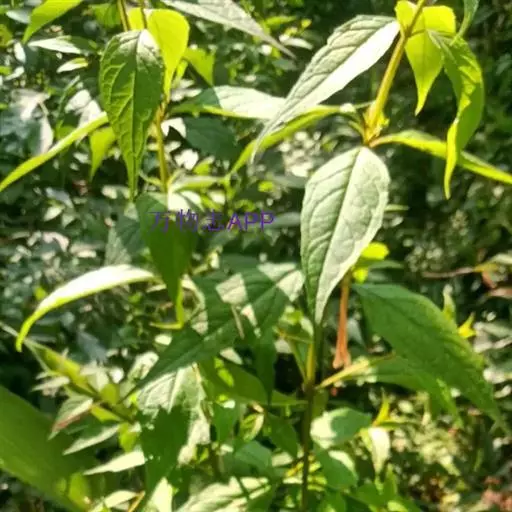 叶对生,萌芽枝条上的叶为互生或近轮生,叶片膜质,卵形、椭圆形至长圆状披针形,长3-11厘米,宽1-5厘米,顶端渐尖,基部宽楔形至圆形,边缘全缘或具有波状齿,上面深绿色,幼时被星状短柔毛,后变无毛,下面灰黄绿色;侧脉每边6-8条,上面扁平,干后凹陷,下面略凸起;叶柄长2-15毫米。