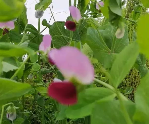 豌豆(学名:Pisum sativum L.)豆科一年生攀援草本,高0.5-2米。全株绿色,光滑无毛,被粉霜。叶具小叶4-6片,托叶心形,下缘具细牙齿。小叶卵圆形;花于叶腋单生或数朵排列为总状花序;花萼钟状,裂片披针形;花冠颜色多样,随品种而异,但多为白色和紫色。子房无毛,花柱扁。荚果肿胀,长椭圆形;种子圆形,青绿色,干后变为黄色。花期6-7月,果期7-9月。