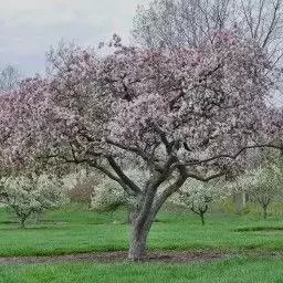 杏树是乔木,高5-8(12)米;树冠圆形、扁圆形或长圆形;树皮灰褐色,纵裂;多年生枝浅褐色,皮孔大而横生,一年生枝浅红褐色,有光泽,无毛,具多数小皮孔。