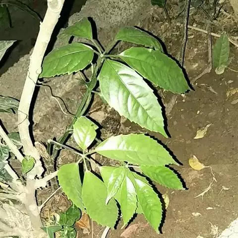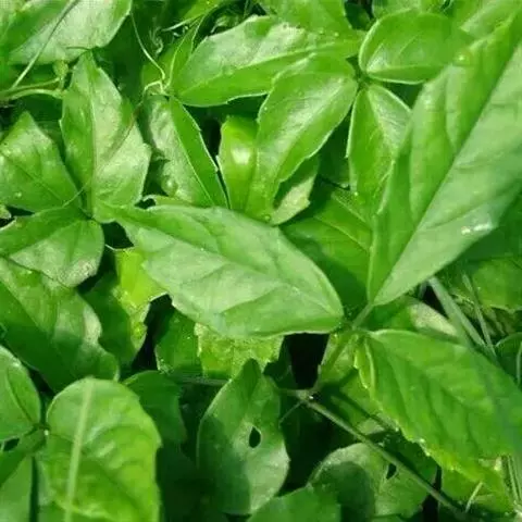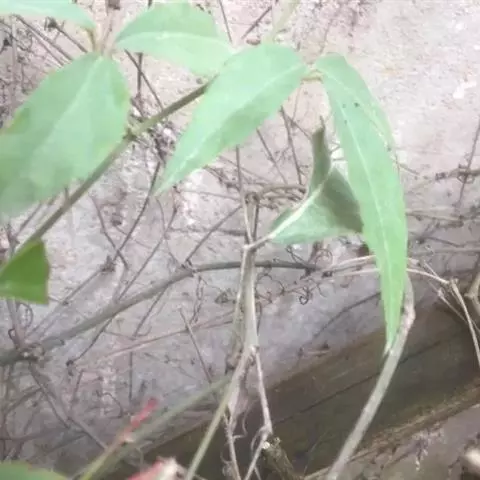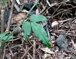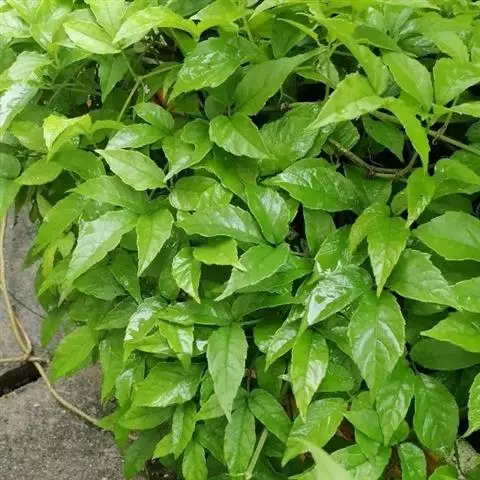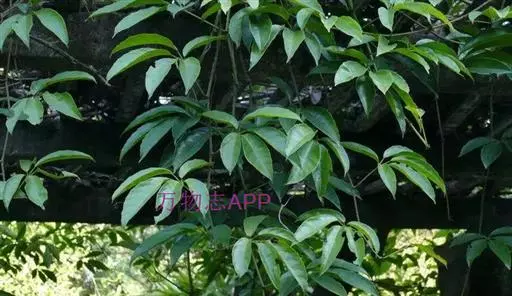 木质大藤本,茎扁压,深褐色。小枝圆柱形或微扁,有纵棱纹,无毛。卷须不分枝, 相隔2节间断与叶对生。叶为掌状5小叶,小叶长圆披针形、披针形、卵披针形,长(6) 9-16厘米,宽(2.5) 3-6 (7)厘米,顶端渐尖或急尖,基部楔形,边缘每侧有5-9个锯齿,锯齿不明显或细小,稀较粗,上面绿色,下面浅绿色,两面无毛;侧脉5-6对,网脉突出;叶柄长3-11厘米,无毛,小叶柄长0.5-3厘米,中央小叶柄比侧生小叶柄长2-4倍,无毛。