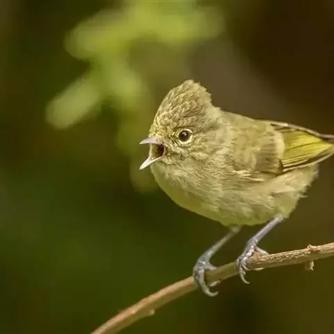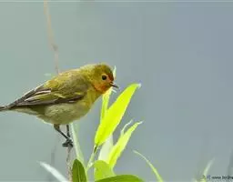 雌鸟额、眼先、头顶、枕和背灰绿色,后颈有一淡黄色斑。腰亦为灰绿色但稍淡,两翅覆羽和飞羽黑褐色,外翈羽缘绿色,中覆羽、大覆羽和三级飞羽具淡黄白色端斑。脸颊、耳羽以及颏和喉白色或灰白色,其余下体淡黄沾绿色。