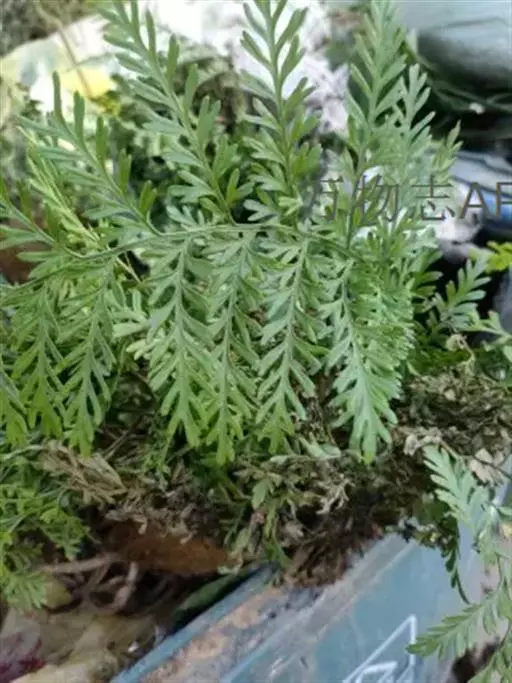 叶簇生;叶柄长8-18厘米,粗1.5-2毫米,淡绿色,上面有纵沟,干后压扁,幼时与叶片通体疏被褐色的纤维状小鳞片,以后陆续脱落而渐变光滑;叶片线状披针形,长10-25厘米,宽3-4.5厘米,尾头,二回羽状;羽片20-24对,相距1-1.4厘米,下部(或基部)的对生,向上互生,斜向上,近无柄,彼此密接,下部羽片通常不缩短,几中部的长1.3-2.2厘米,宽0.8-1.2厘米,狭椭圆形,圆头,基部不对称,上侧截形,紧靠叶轴,下侧斜切,羽状;小羽片互生,上先出,上侧有2-5片,下侧0-3(-4)片,斜向上,疏离,狭线形,略向上弯,长4-10毫米,宽1-1.5毫米,钝头,基部与羽轴合生并以阔翅相连,全缘,上侧基部1-2片常再二至三裂,基部下侧一片偶为二裂;裂片与小羽片同形而较短。叶脉明显,略隆起,每小羽片或裂片有小脉1条,先端有明显的水囊,不达叶边。叶近肉质,干后草绿色,略显细纵纹;叶轴与叶柄同色,顶端往往延长成鞭状而生根,羽轴与叶片同色,上面隆起,两侧有狭翅。