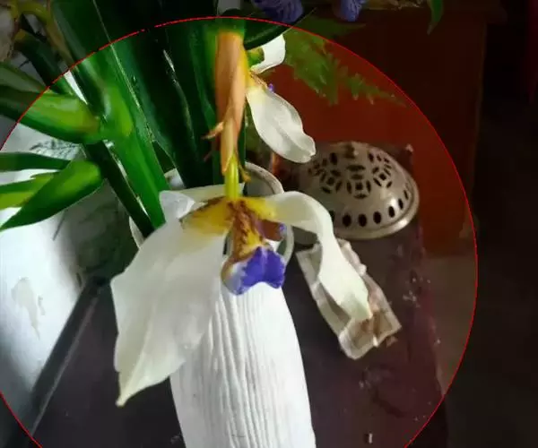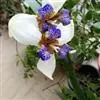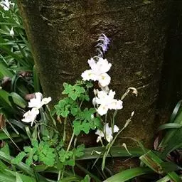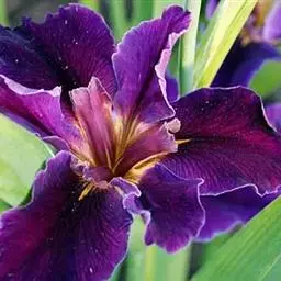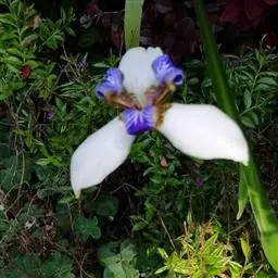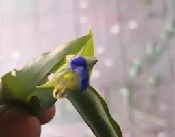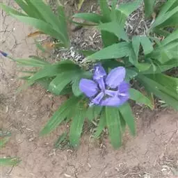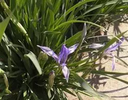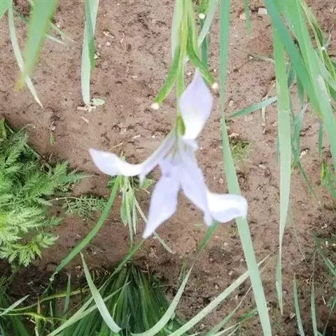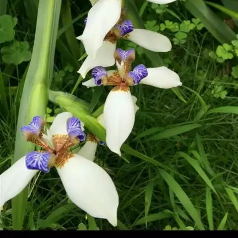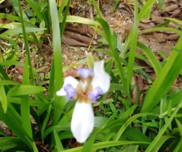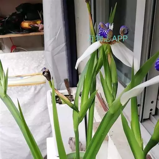 巴西鸢尾株高约40~50公分,叶从基部根茎处抽出,呈扇形排列。叶宽约2公分,革质,深绿色;花期约春至夏 巴西鸢尾 季,花茎扁平似叶状,但中肋较明显突出,花从花茎顶端鞘状苞片内开出,花有6瓣,3瓣外翻的白色苞片,基部有红褐色斑块,另3瓣直立内卷,为蓝紫色并有白色线条。花通常上午开放,至下午3~4点就开始内卷枯萎了,但花鞘内的花开完後,会长出小苗,小苗越长越大最後降至土表,发根成苗,而小苗隔年就有开花能力。 巴西鸢尾的繁殖方式很奇特,像吊兰一样,在开花后会从花鞘内长出小苗。