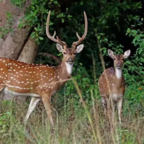 坡鹿是偶蹄目鹿科鹿属动物,体长1.6米左右,体重60~100千克。体形狭长,颈部和四肢也较为细长,…