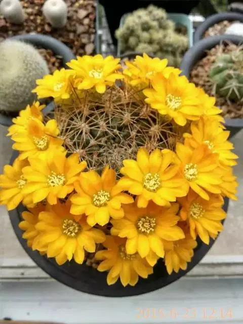 江守玉为仙人掌科强刺球属,植株扁圆形至球形,后成圆柱状,体色灰绿,刺座上附生白色绒毛,花橙黄色,漏…