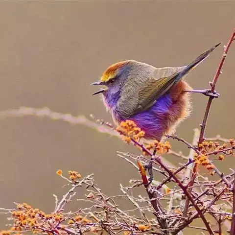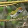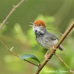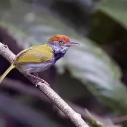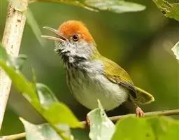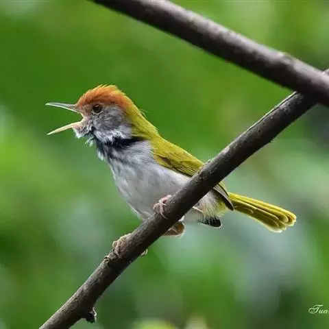 黑喉缝叶莺:体长11.5厘米,是一种小型的顶冠棕色、腹部白色的莺。尾甚长而常上翘,臀黄色,…