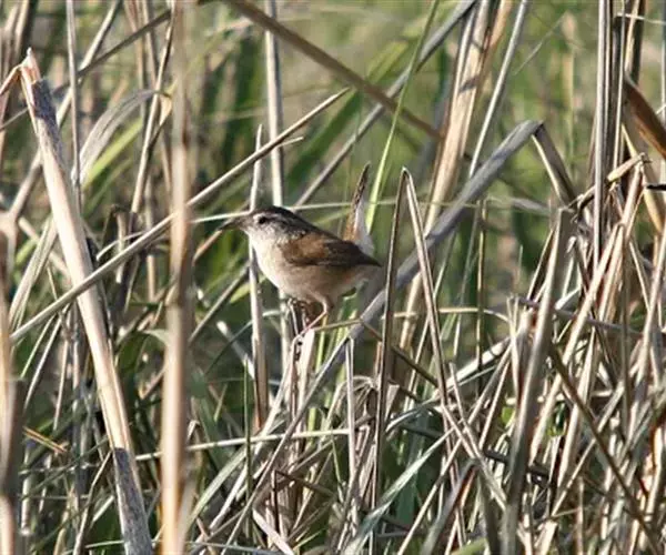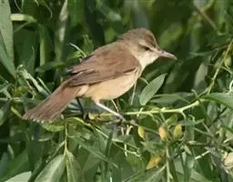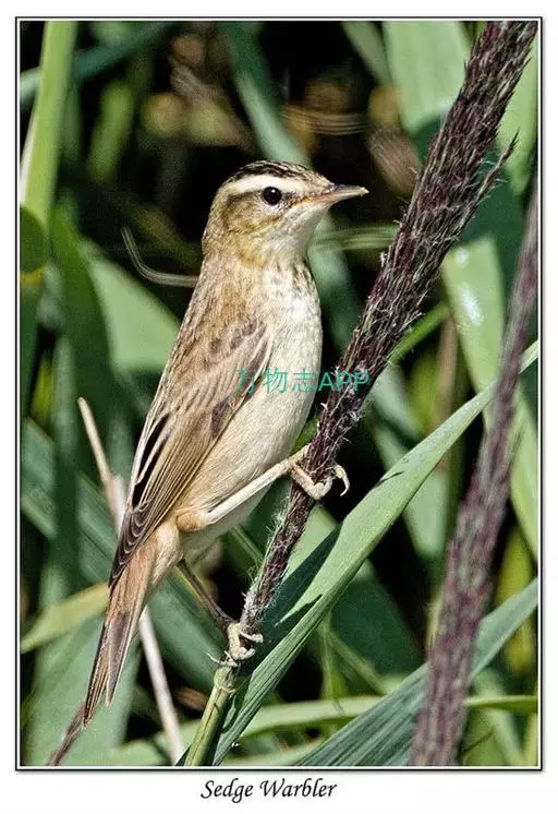 水蒲苇莺(学名:Acrocephalus schoenobaenus):小型鸟类,体长12-14厘米。雌雄两性羽色相似。上体褐色,头顶和背具粗著的黑褐色轴纹;腰和尾上覆羽较淡棕色,无轴纹;头顶黑褐色轴纹常沿纵轴排列成行;眉纹皮黄色或灰白色,宽阔而明显;贯眼纹黑褐色;耳下覆羽较四周羽毛色暗;两翅和尾褐色而沾灰,外翈羽缘红褐色;下体白色,或淡土黄色;两胁较暗;腋羽白色,有时稍沾土黄色;翅下覆羽淡银灰色,羽缘土白色。
