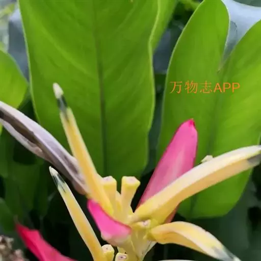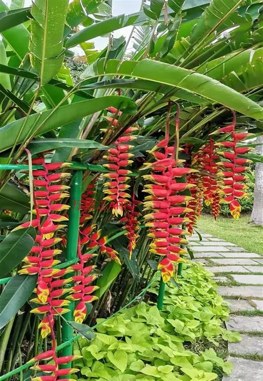 蝎尾蕉(学名:Heliconia metallica Planch. et Linden ex Hook. f.):芭蕉科,蝎尾蕉属多年生草本植物。株高可达260厘米。叶片长圆形,叶面绿色,叶背亮紫色;顶生花序,直立,薄被短柔毛;苞片绿色,开放时突露,花被片红色,顶端绿色,狭圆柱形,果三棱形,灰蓝色,有种子不多于3颗。
