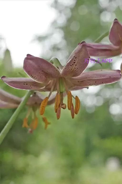 总状花序有花1-6朵;苞片叶状,条形,长约2厘米,顶端不加厚;花梗长6-18厘米,直立,先端弯曲;花下垂,有香味;花被片披针形,反卷,长3.5-4.5厘米,宽8-10毫米,先端钝,淡紫红色,下部有深紫色斑点,蜜腺两边密生乳头状突起;花丝长约2厘米,无毛,花药长1.4厘米,黑紫色;子房圆柱形,长8-10毫米,宽2毫米;花柱长1.5-1.7厘米。花期7月。