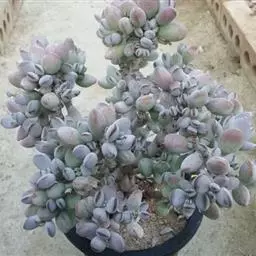 乒乓福娘,植株叶片退化成扁卵状,植株为直立的肉质灌木,能够长高。叶片对生,扁卵型至圆卵形,叶片顶端紫红圆叶尖,叶面有一层白粉。强光下叶片的顶端边缘会较红。初夏开花,聚伞状圆锥花序,花序较高,小花管状下垂,花开橙红色,先端五裂,花蕾看起来象一个个挂着的小辣椒。