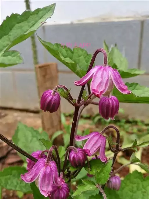 聚伞花序腋生,1-3花;花梗细瘦,长2-4厘米,基部有一对叶状苞片;花钟状,直径1.5厘米;萼片4枚,紫红色,卵圆形,长1-2厘米,宽5-6毫米,边缘密被淡黄色绒毛,两面微被柔毛,外面脉纹上有2-4条凸起的翅;雄蕊与萼片近于等长,花丝具一脉,被长柔毛,花药线形,无毛,药隔背面被毛;心皮比雄蕊微短,被毛。