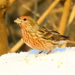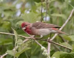 红腰朱雀:体长12-14厘米,小型鸟类。雄鸟前额和眉纹玫瑰粉红色,头顶和一宽的贯眼带深红褐色,背红…