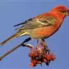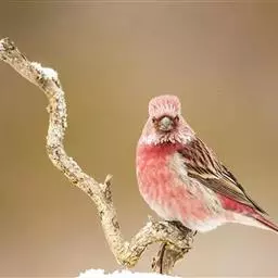 大朱雀(学名:Carpodacus rubicilla):体重33-52克;体长167-205毫米;体形较大;为不常见留鸟。体羽深红色;羽中央具白色或带粉白色斑点,颊深红色;雌鸟体羽淡灰色,稍暗的颊具有阴暗或带褐色斑纹;下背和腰无斑纹。