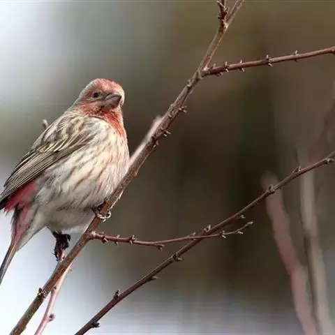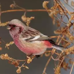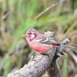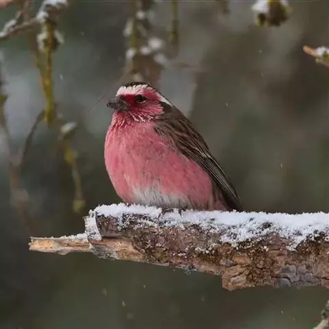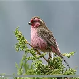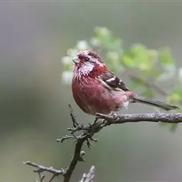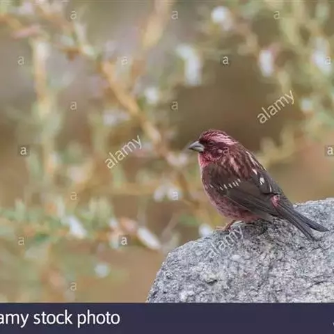藏朱雀:全长约17-18厘米。雄鸟头部深红色具光辉,喉部暗红色具白色点斑;背部灰白色,各羽具玫瑰红…