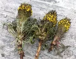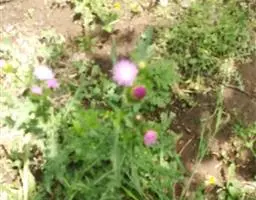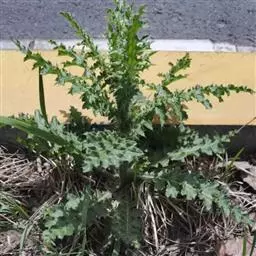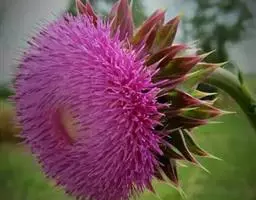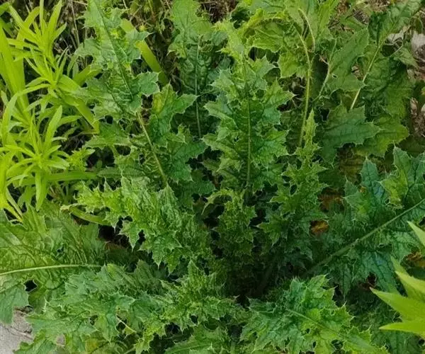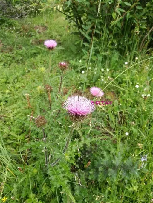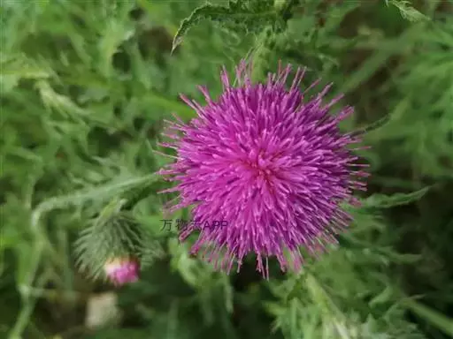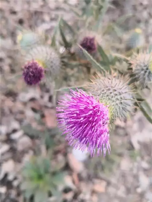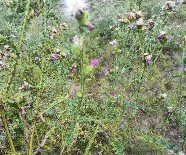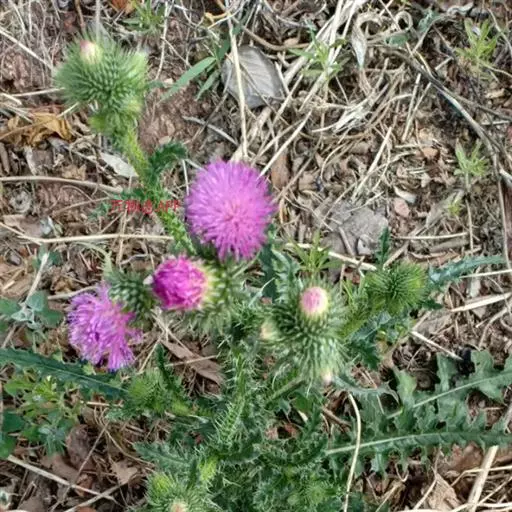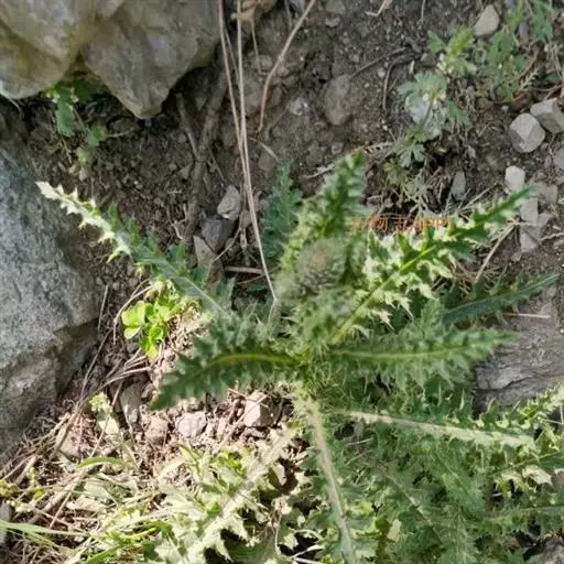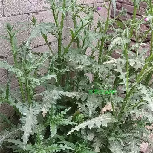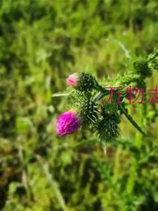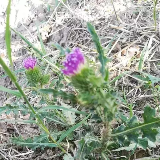 飞廉属菊科植物,为二年生或多年生草本植物,茎圆柱形,具纵棱,并附有绿色的翅,翅有针刺。叶椭圆状披针形,羽状深裂,裂片边缘具刺,头状花序干缩,总苞钟形,黄褐色,花紫红色,冠毛刺状,黄白色,气味微弱。