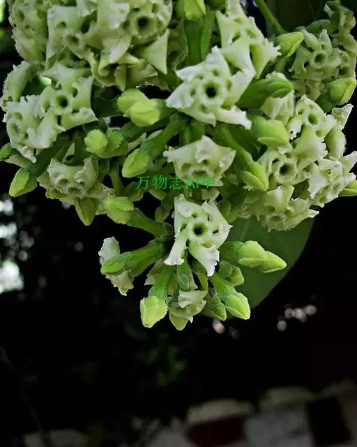 花多朵集成顶生聚伞花序,长约4厘米;总花梗长1.5-3厘米;花萼裂片卵圆形,长0.7-1.5毫米,外面无毛或被微柔毛,具缘毛;花冠高脚碟状,花冠筒圆筒形,长5-6毫米,外面被柔毛,内面被长柔毛,喉部更密,花冠裂片广椭圆形,白色,长3-6毫米,宽约2.5毫米,外面被微毛,内面被柔毛;雄蕊着生在花冠筒中部,花药长1-1.5毫米,顶端不伸出花冠喉外,花丝丝状,短;无花盘;子房由2枚合生心皮组成,无毛,花柱圆柱状,长约3毫米,柱头棍棒状,顶端2裂,每心皮胚珠多数。