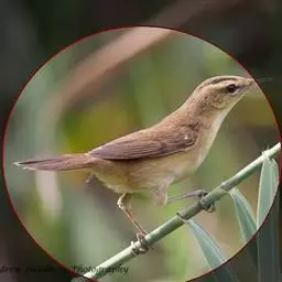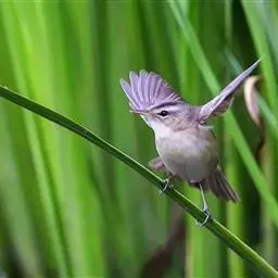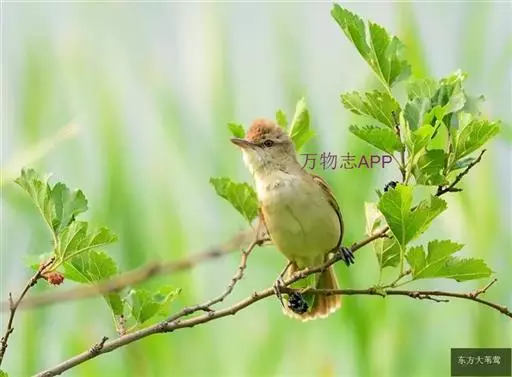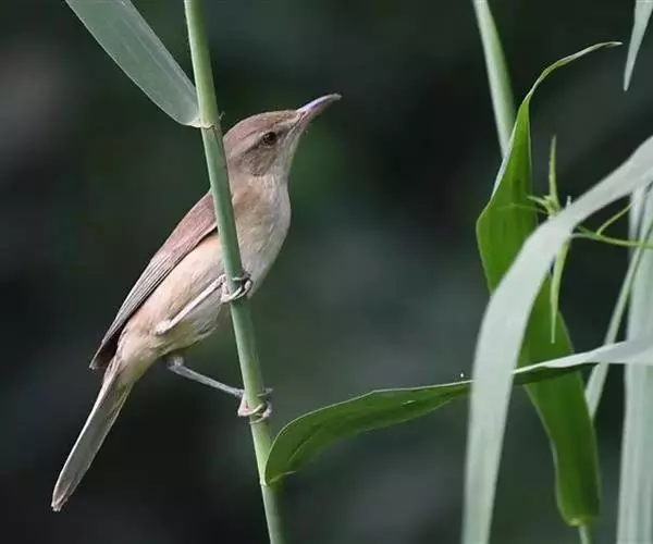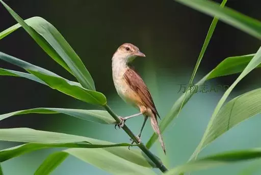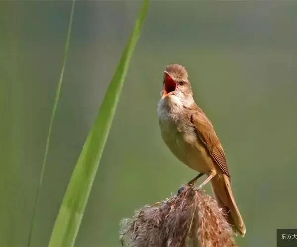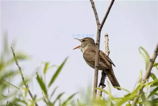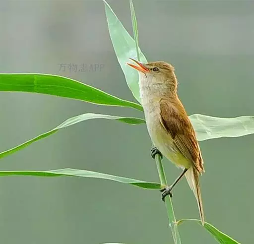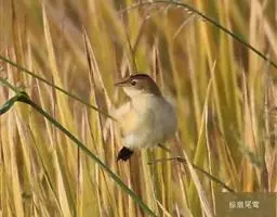 东方大苇莺(学名:Acrocephalus orientalis):体长18-19厘米,体重22-29克。体型略大的褐色苇莺。具显著的皮黄色眉纹。上体呈橄榄褐色。下体乳黄色。第1枚初级飞羽长度不超过初级覆羽。虹膜褐色;上嘴褐色,下嘴偏粉;脚灰色。