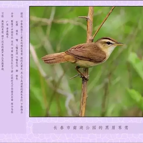 黑眉苇莺:体重7-11克,体长11-13厘米。上体橄榄棕褐色;眉纹淡黄色,…