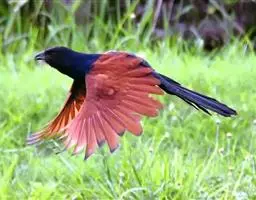 斑翅凤头鹃: 成鸟具羽冠,上体及头侧、翅、尾等黑色,具铁绿色亮辉,尾羽端部具白斑,两侧者形宽,…