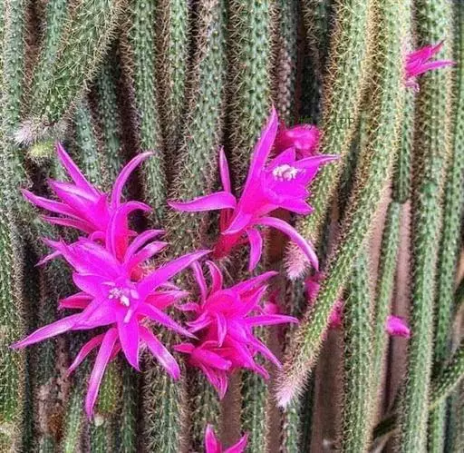 鼠尾掌(Aporocactus flagelliformis (L.) Lem.)茎细长,匍匐,多分枝,长可达2米,幼时亮绿色,后变灰绿色。具浅棱10-14,辐射刺10-20,新刺红色,后变黄至褐色。4-5月开花,花两侧对称,粉红色,昼开夜闭。浆果球形,红色。