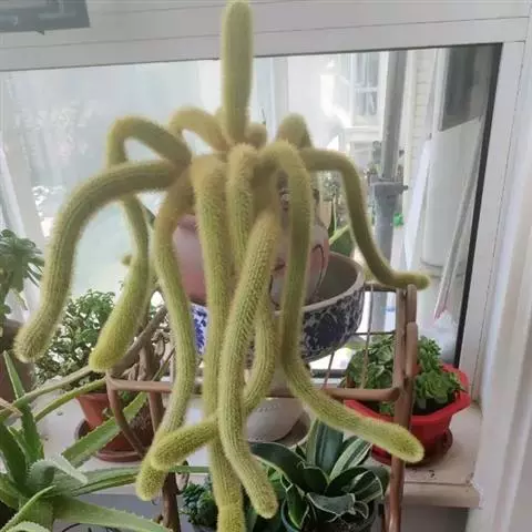 7、修剪:鼠尾掌茎细长,呈匍匐状,多分枝,盆栽时需设立支架或悬挂吊盆栽培,须整株修剪,保持优美株态。