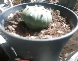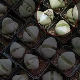 荒玉为番杏科生石花属,原产南非。株体呈白粉色,表面布满凹凸纹路,凹陷处为红褐色,每年秋季开黄花。