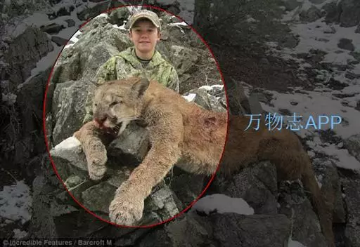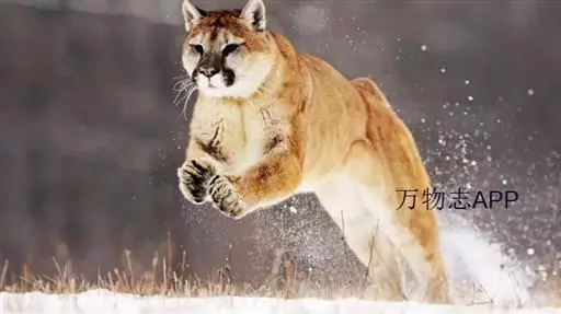 美洲狮(学名:Puma concolor):又称美洲金猫,大小和花豹相仿,但外观上没有花纹且头骨较小。体长130-200厘米,尾长约100厘米,肩高55-80厘米,体重35-100千克,为猫亚科中最大者。雄性比雌性大近1倍。躯体均匀,四肢中长,趾行性。头大而圆,吻部较短,视、听、嗅觉均很发达。犬齿及裂齿极发达;上裂齿具三齿尖,下裂齿具2齿尖;臼齿较退化,齿冠直径小于外侧门齿高度。皮毛柔软,全身为单一的灰色、红棕色或红色。前足5趾,后足4趾;爪锋利,可伸缩。尾较发达。