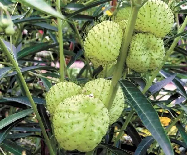 直立灌木,株高 80~150 公分,具多数分枝,具乳汁;枝条细长,直立或斜上升,嫩枝绿色,老枝灰白色,具细柔毛。叶对生,披针形或线状披针形,长 10~13 公分,宽 1~2 公分,先端渐尖或锐尖,基部钝而延伸至叶柄,纸质,全缘,表面呈有光泽的绿色,背面淡绿色;表里两面皆光滑无毛;中肋于表面略凹下而于背面显著隆起,侧脉不明显;叶柄长 0.5~0.9 公分,光滑无毛。花多数,白色,无香味,开放时径 0.9~1.1 公分,呈繖形状聚繖花序;花序抽自于对生叶之叶柄间,长 2~4 公分,略带柔毛;花柄细长,长 1.2~2 公分,有柔毛;花萼深 5 裂,裂片披针形,长 0.5~0.6 公分,先端渐尖,有毛茸;花冠几从基部便 5 裂;裂片卵状长椭圆形,反卷,长 0.7~0.8 公分,宽约 0.4 公分,先端钝,表里两面皆光滑无毛,毛缘;雄蕊柱长约 0.4 公分;副冠鳞片 5 枚,卵形白色,长 0.2~0.4 公分,先端钝。秋至春季开花。果实为蓇葖果,卵形或圆卵形,长 5~8 公分,径 3~6 公分,如膨胀的汽球,中空没有果肉,内藏多数种子,成熟时为绿色,密布刚毛或棘刺,也散生毛茸;成熟后后开裂,种子圆卵形,长 0.3~0.4 公分,无丛毛,成熟时带黑色,种子具白色绒毛可飞散,春至秋季结果。