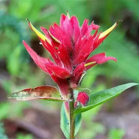 一年生草本,直立,高约30-60厘米,有时可达80厘米,干时变为黑色,密被锈色短毛。主根不发达或稍稍伸长,木质,直径约2毫米,有的增粗,直径可达4毫米,很快即分为多数粗细不等的侧根而消失,侧根长3-7厘米,纤锥状,常水平开展,须根多数,散生。茎多单条,中空,基部常有少数宿存膜质鳞片,下部常不分枝,而上部多分枝;枝对生,1-6对,细长,坚挺,多少以45°角叉分,稍具稜角,密被无腺短毛。叶对生,全部为茎出,下部者常早枯,上部者茂密,相距很近,仅1-2厘米,无柄或有短柄,柄长可达1厘米,叶片基部下延,扁平,密被短毛;叶片厚纸质,广卵形,长约8-55毫米,宽约4-60毫米,两面皆密被短毛,中肋在上面微凹入,背面明显凸出,缘作疏远的二回羽状全裂,裂片仅约3对,仅下方两枚羽状开裂,小裂片1-3枚,外侧者较长,内侧裂片较短或无,线形或线状披针形,宽约l-2毫米,锐尖头,全缘。花对生于茎枝上部,或有时假对生,构成疏稀的总状花序;苞片叶状,较萼短,羽状深裂或全裂,密被短毛;花梗短,长约1-2毫米,纤细,密被短毛,有一对小苞片,线形,长约10毫米;花萼管部很长,顶端稍缩紧,长约10-15毫米,厚膜质,密被短毛,10条主脉质地厚而粗壮,显著凸出,使处于其间的膜质部分凹下成沟,无网纹,齿5枚,绿色,质地较厚,密被短毛,长约为萼管的1/4-1/3,线状披针形或卵状长圆形,近于相等,全缘,或偶有1-2锯齿;花冠上唇红紫色,下唇黄色,长约22-25毫米,外面密被长纤毛,内面被短毛,花管伸直,纤细,长约12-14毫米,顶端略膨大,稍伸出于萼管外,上唇镰状弓曲,顶端截形,额稍圆,前方突然向下前方作斜截形,有时略作啮痕状,其上角有一对短齿,背部密被特长的纤毛,毛长约1-2毫米;下唇约与上唇等长或稍长,顶端3裂,裂片卵形,端均具小凸尖,中裂与侧裂等见而较短,向前凸出,褶襞的前部高凸并作袋状伸长,向前伸出与侧裂等长,向后方渐低而终止于管喉,不被长纤毛,沿褶缝边缘质地较薄,并有啮痕状齿;雄蕊二强,着生于花管的中上部,前方一对花丝较短,着生的部位较高,2对花栋下部被短纤毛,花药2室,长椭圆形,背着,纵裂,开裂后常成新月形弯曲;子房长卵形,长约4毫米,柱头头状,常伸出于盔外。蒴果被包于宿存的萼内,约与萼管等长,披针状长圆形,长约15毫米,直径约2.5毫米,顶端稍偏斜,有短尖头,黑褐色,稍具光泽,并有10条不十分明显的纵沟较;种子多数,黑色,长卵圆形,长约0.8毫米,具微高的纵横凸起,横的约8-12条,纵的约8条,将种皮隔成许多横长的网眼,纵凸中有5条凸起较高成窄翅,一面有1条龙骨状宽厚而肉质半透明之翅,其顶端稍外卷。花期6-8月。