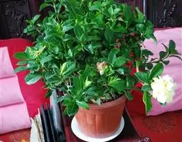栀子花,花朵簇状约30枚瓣,奶油色,中心黄色;花径12cm;气味果香.