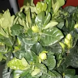 栀子花,花朵簇状约30枚瓣,奶油色,中心黄色;花径12cm;气味果香.
