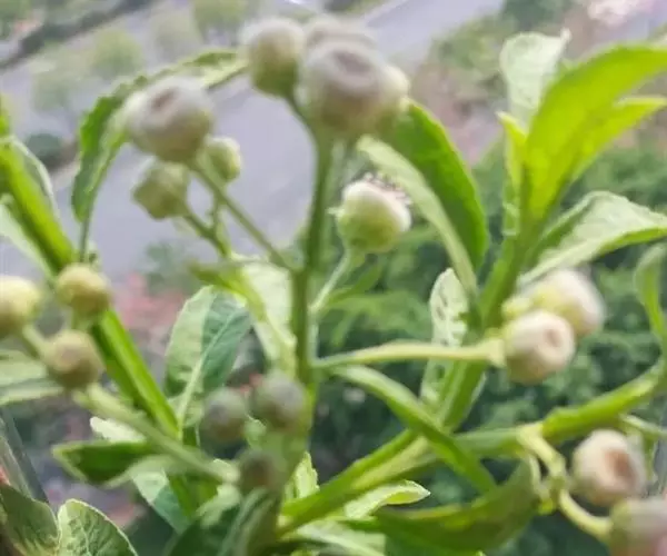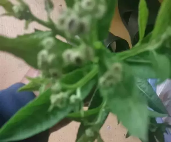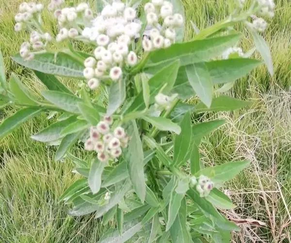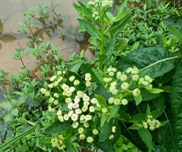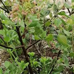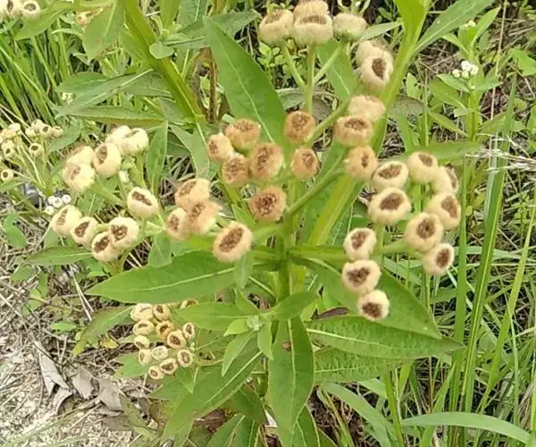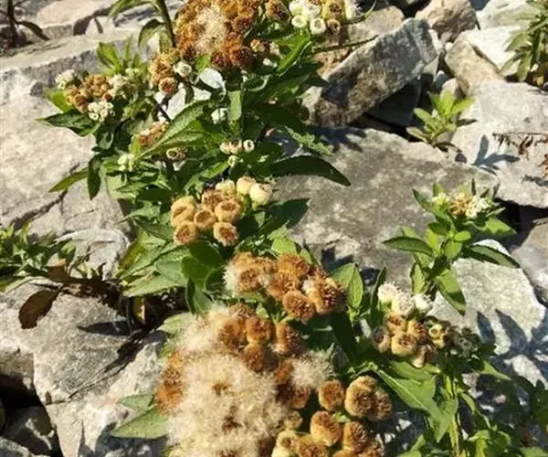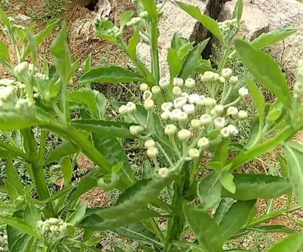翼茎阔苞菊是一年生草本植物,茎直立,全株具浓厚的芳香气味,且被浓密的绒毛,最明显的特征是自叶基部向下延伸到茎部的翼。