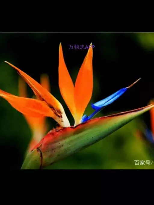 鹤望兰(Strelitzia reginae Aiton)芭蕉科鹤望兰亚科 多年生草本植物,无茎。叶片长圆状披针形,长25-45cm,宽10cm。叶片顶端急尖;叶柄细长。花数朵生于总花梗上,下托一佛焰苞;佛焰苞绿色,边紫红,萼片橙黄色,花瓣暗蓝色;雄蕊与花瓣等长;花药狭线形,花柱突出,柱头3。花期在冬季。