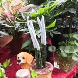圆叶虎尾兰又名棒叶虎尾兰、筒叶虎尾兰、筒千岁兰等,茎短或无,肉质叶呈细圆棒状,顶端尖细,质硬,直立生长,有时稍弯曲,叶长80~100厘米,直径3厘米,表面暗绿色,有横向的灰绿色虎纹斑。总状花序,小花白色或淡粉色。