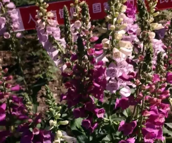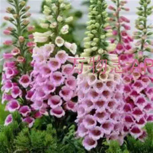 毛 地黄(Digitalis purpurea L) :为玄参科、毛地黄属二年生或多年生草本植物。除花冠外,全体被灰白色短柔毛和腺毛,有时茎上几无毛,高60-120厘米。茎单生或数条成丛。叶片卵圆形或卵状披针形,叶粗糙、皱缩、基生叶具长柄,卵形至卵状披针形,叶缘有圆锯齿,叶柄具狭翅,叶形由下至上渐小。顶生总状花序长50~80cm,花冠钟状长约7.5cm,花冠蜡紫红色,内面有浅白斑点。蒴果卵形,花期5~6月,果熟期8~10月,种子极小。人工栽培品种有白、粉和深红色等,一般分为白花自由钟,大花自由钟,重瓣自由钟。常用于花境、花坛及岩石园中,还可作自然式花卉布置。