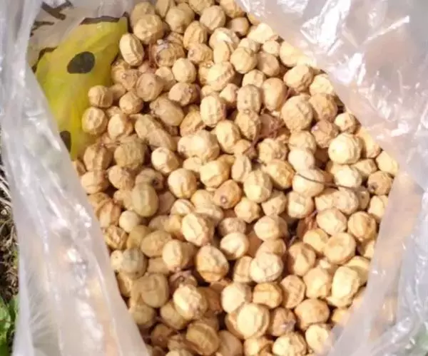 鹰嘴豆开花结荚期很长,结荚部位分散,植株上下部成熟期往往不一致。因此,宜于70%的荚呈黄白色,而籽粒与荚之间已经分离之时及时进行收获。收获过早,未成熟籽粒多;收获过晚则落荚严重。收获可手工连根拔起或镰刀收割。收割后拉运至晒场晒干,压场脱粒,人工扬场清选,有条件的地方可用扬场机和清粮机进行清选。清选后的鹰嘴豆籽粒,应及时摊开晾晒,直至含水量达12%以下,再用磷化铝熏蒸后入库贮藏。豆象是鹰嘴豆储藏时最易发生的虫害,最有效的方法是用磷化铝等药物熏蒸。储藏期间必须注意通风、降温和除湿。