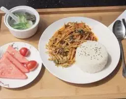 烤肉饭主料由土豆,烤肉、青豆等食材,辅料由葱,姜,蒜,洋葱,生抽,老抽,蜂蜜,耗油,…