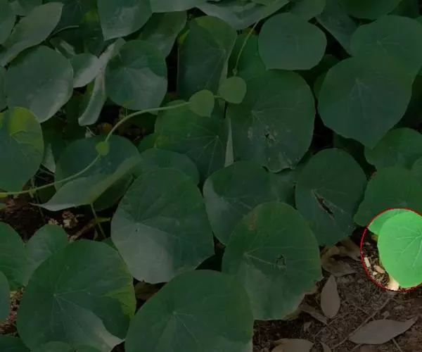叶互生;叶柄长6-31厘米,向上扭曲,盾状,着生于叶片的近 中心处;叶片圆形,直径3-10厘米,有主脉9条.由叶柄着生处向四面放射,边缘为波浪形的浅缺刻,背面通常被疏毛或有乳凸点。