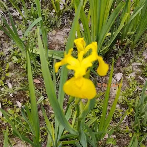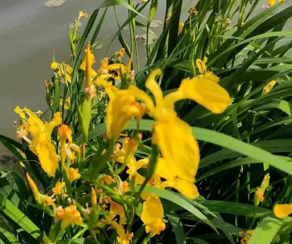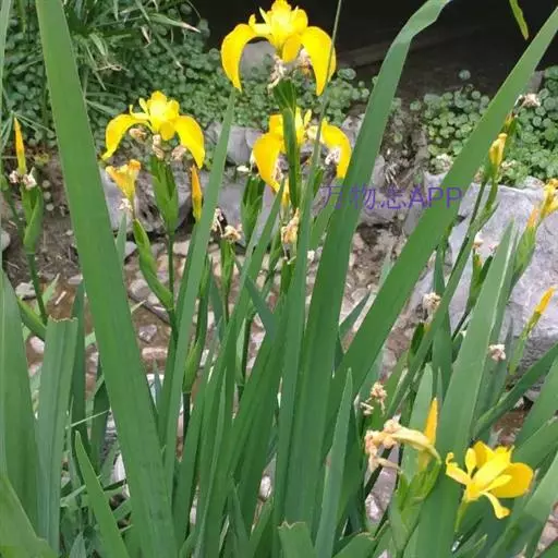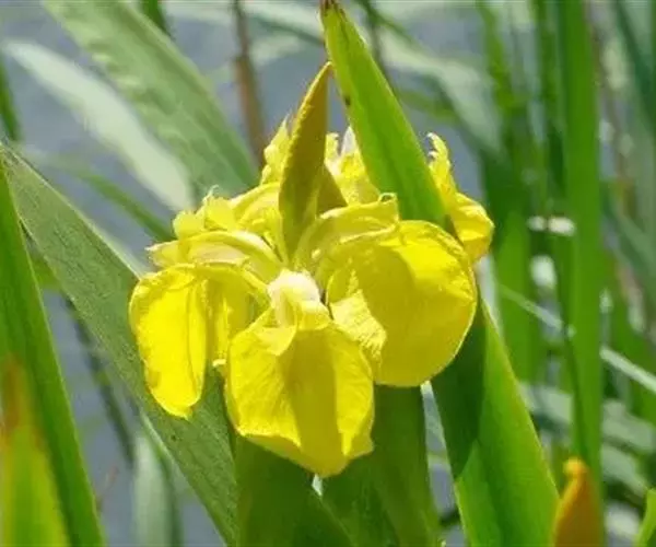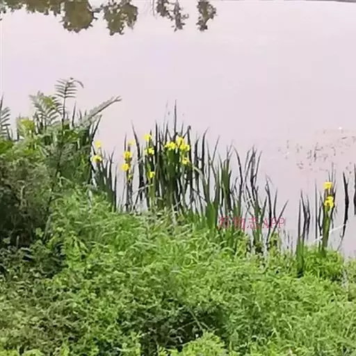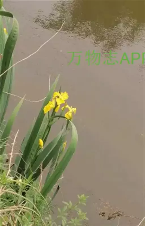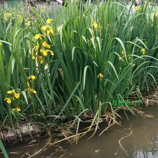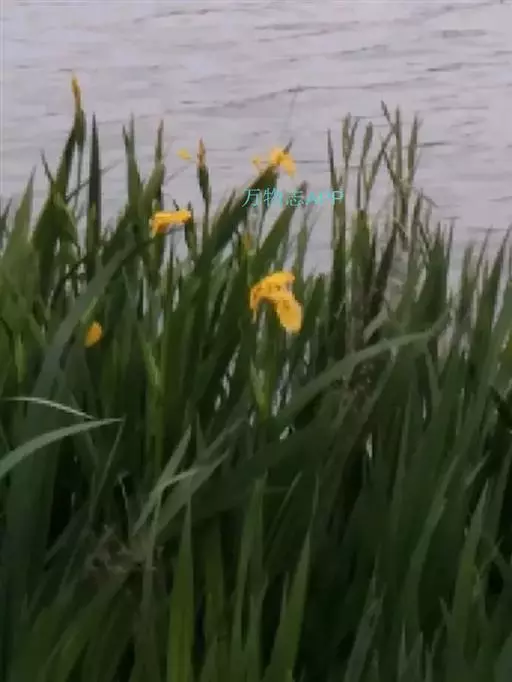 黄菖蒲(学名:Iris pseudacorus L.):是多年生湿生或挺水宿根草本植物,植株高大,根茎短粗。叶子茂密,基生,绿色,长剑形,长60-100厘米,中肋明显,并具横向网状脉 。花茎稍高出于叶,垂瓣上部长椭圆形,基部近等宽,具褐色斑纹或无,旗瓣淡黄色,花径8厘米。蒴果长形,内有种子多数,种子褐色,有棱角。花期5-6月份。