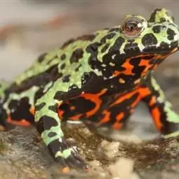 东方铃蟾(学名:Bombina orientalis)是铃蟾科、铃蟾属两栖动物。体长36-48毫米左右头扁平,吻圆,前、后肢短,皮肤粗糙,刺黑色,背部呈灰棕色,或背为绿色杂以不规则的黑色斑点,腹面有花斑,为黑色与朱红色或桔黄色。雄性前肢较粗壮,前臂直径为体长的11%(雌性8.4%),前臂内侧、内掌突及内侧3指基部有黑色细刺;无声囊和雄性线。雄性趾间为全蹼,雌性的蹼缺刻较深。