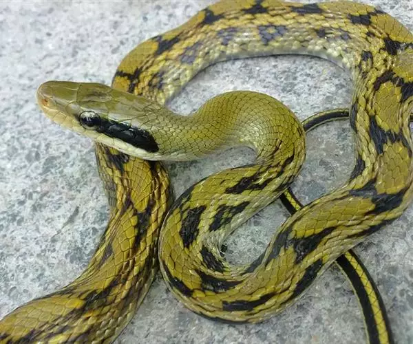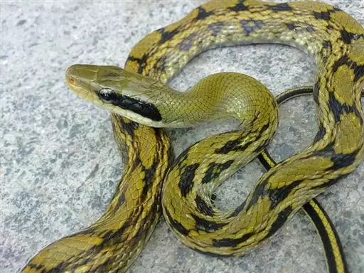 黑眉锦蛇(Elaphetaeniura)的主要特征是头体背面黄绿色或棕灰色,眼后具一条黑色眉状纹,这是其最主要的鉴别特征;体前部背面具有如秤星般的黑色梯状横斑,体后部有四条黑色纵纹直达尾端,背鳞中央数行起棱;无毒。在我国不同的地区,人们根据其颜色、斑纹等特征,称它为黄颌蛇、黄喉蛇、黄长虫、菜花蛇、三索蛇或者秤星蛇等。