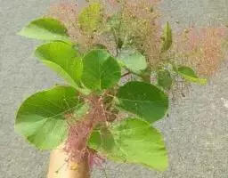 粉背黄栌叶卵圆形,较大,长3.5-10厘米,宽2.5-7.5厘米,无毛,但叶背显著被白粉;叶柄较长,…