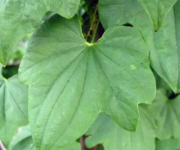 缠绕草质藤本。根状茎横生,圆柱形,多分枝,栓皮层显著剥离。茎左旋,近无毛,长达5米。单叶互生,叶柄长10~20厘米;叶片掌状心形,变化较大,茎基部叶长10~15厘米,宽9~13厘米,边缘作不等大的三角状浅裂、中裂或深裂,顶端叶片小,近于全缘,叶表面黄绿色,有光泽,无毛或有稀疏的白色细柔毛,尤以脉上较密。花雌雄异株。雄花序为腋生的穗状花序,花序基部常由2~4朵集成小伞状,至花序顶端常为单花;苞片披针形,顶端渐尖,短于花被;花被碟形,6裂,裂片顶端钝圆;雄蕊6枚,着生于花被裂片的中央,药内向。雌花序穗状,单生;雌花具有退化雄蕊,有时雄蕊退化仅留有花丝;雌蕊柱头3裂,裂片再2裂。蒴果成熟后枯黄色,三棱形,顶端凹入,基部近圆形,每棱翅状,大小不一,一般长约2厘米,宽约1.5厘米;种子每室2枚,有时仅1枚发育,着生于中轴基部,四周有不等的薄膜状翅,上方呈长方形,长约比宽大2倍。花期6~8月,果期8~10月。