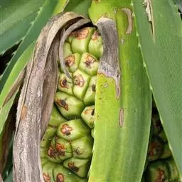 果实梨形,有明显的5条纵沟,瓜顶有一条缝合线。果色由绿色至乳白色,单瓜重250g~500g。果肉乳白色,一个果实内只具一枚种子,果肉与种皮紧密贴合,不易分离;种子扁平,纺锤形。种皮系肉质膜状,不具备控制种子内失水的功能。当种子剥离果实后,极易失水干瘪而丧失生活力。故种子不能晒干贮存,一般均以整个种瓜为繁殖材料。种子无休眠期,成熟后如不及时采收,种子在瓜中就会很快萌发。这一现象称“胎萌”,是佛手瓜的一大特点。